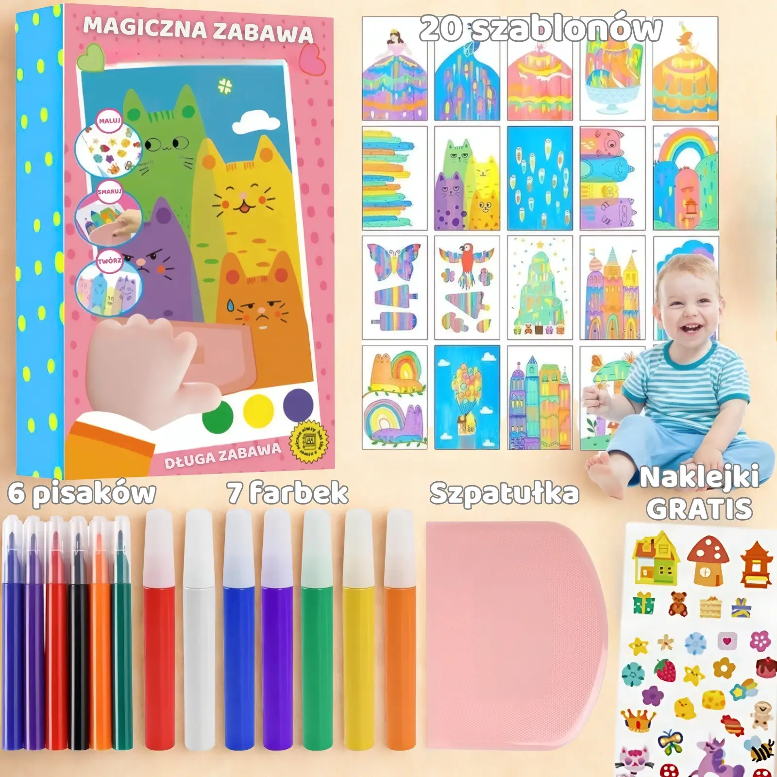 Zestaw zawiera 20 szablonów, kolorowe markery, farbki oraz szpatułkę do rozcierania, wszystko co potrzebne do rozpoczęcia zabawy od razu po otwarciu pudełka.