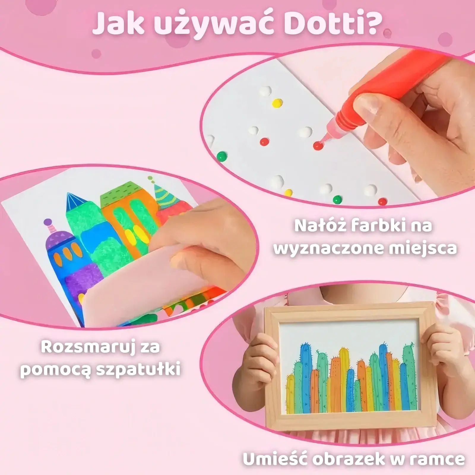 Korzystanie z Dotti jest naprawdę proste! Wystarczy nanieść farbki na oznaczone miejsca i rozetrzeć je szpatułką. W kilka chwil powstają barwne obrazki, które zachęcają dzieci do twórczej zabawy i rozwijają ich wyobraźnię. To świetny sposób na spędzanie czasu w kreatywny i radosny sposób